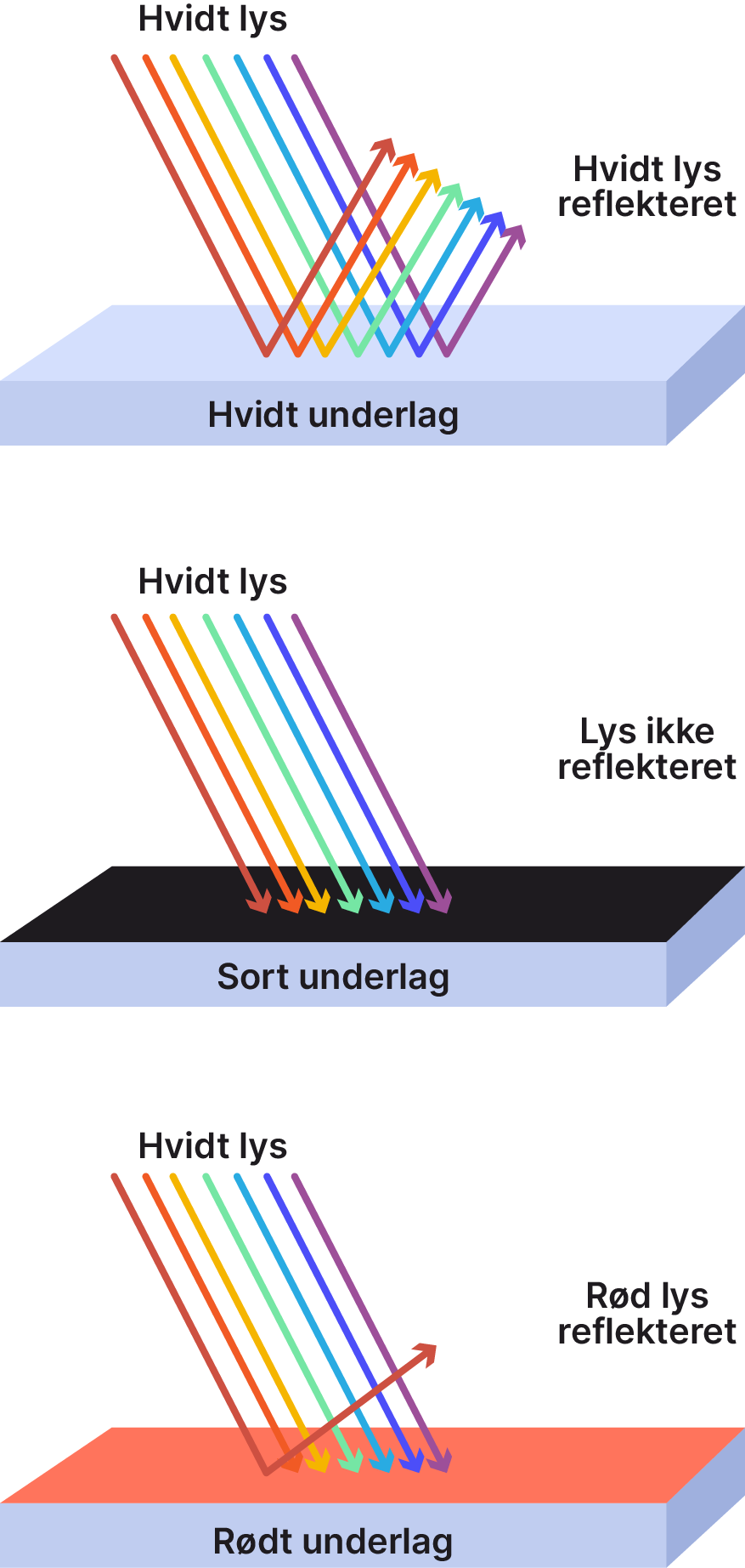 Hvad er korrekt om hvide, røde, blå og sorte genstande?