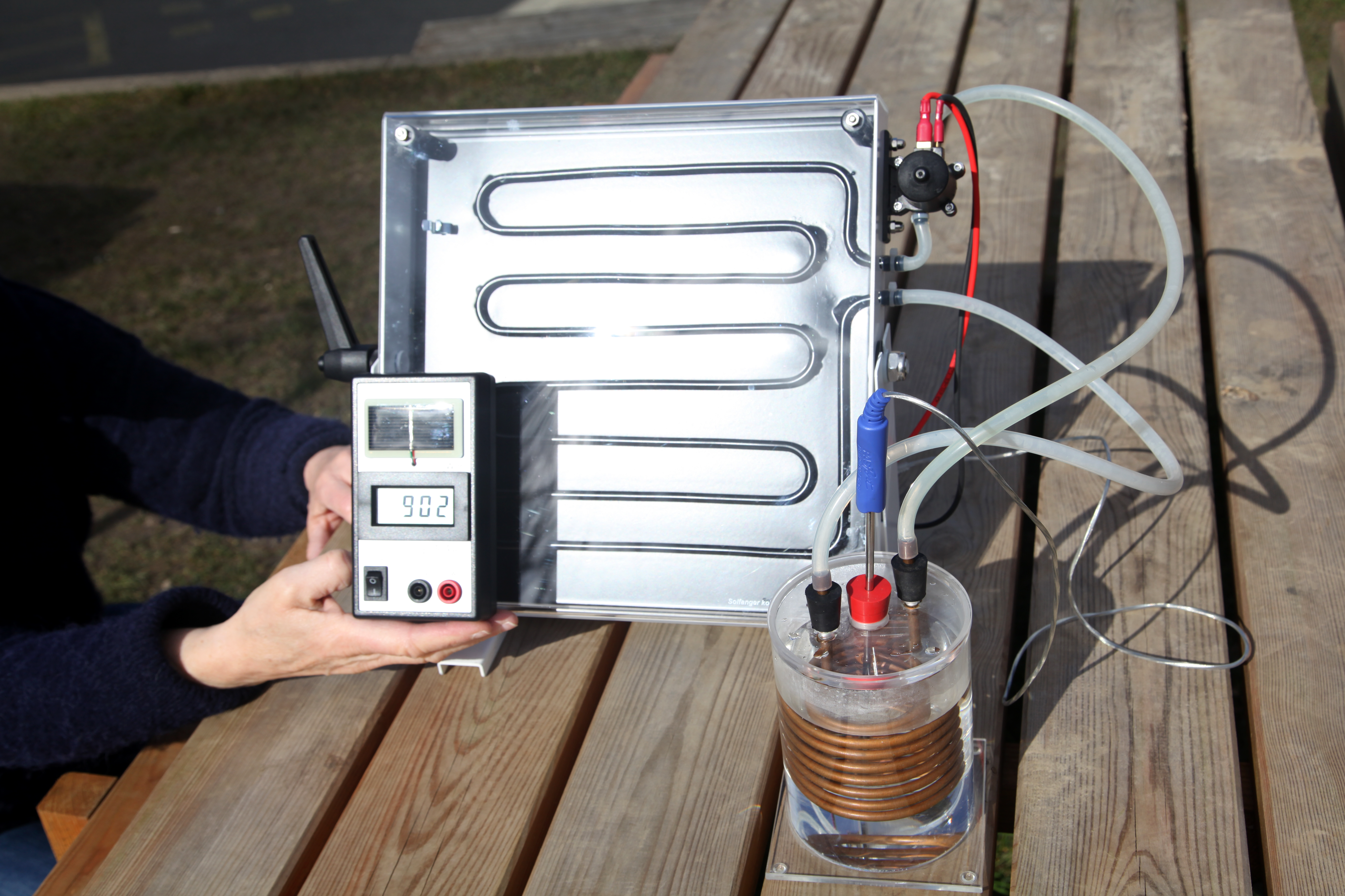 Tilslut solfangerens pumpe til 12 V jævnspænding.