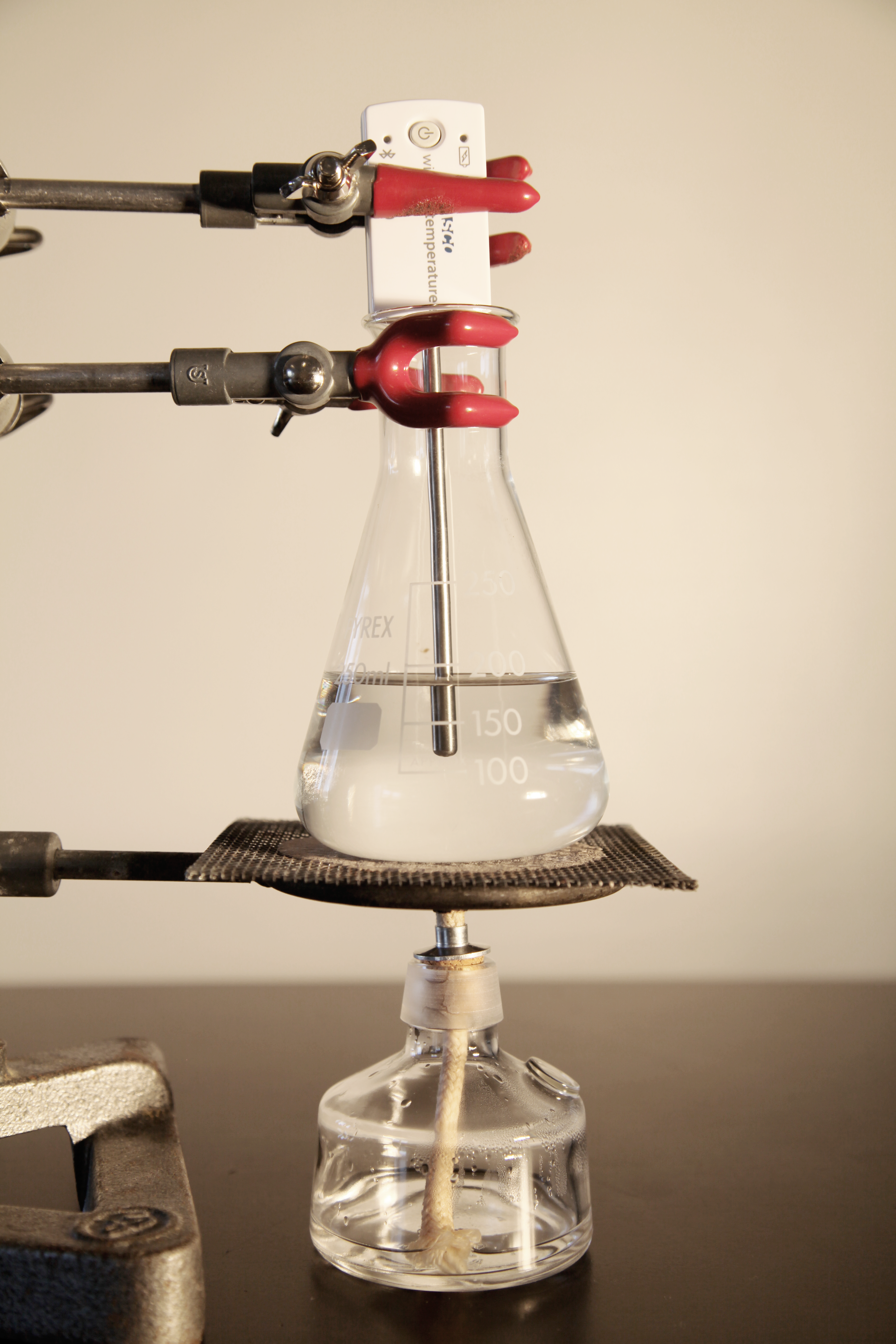 Spænd den koniske kolbe fast i stativet ovenpå trådnettet.