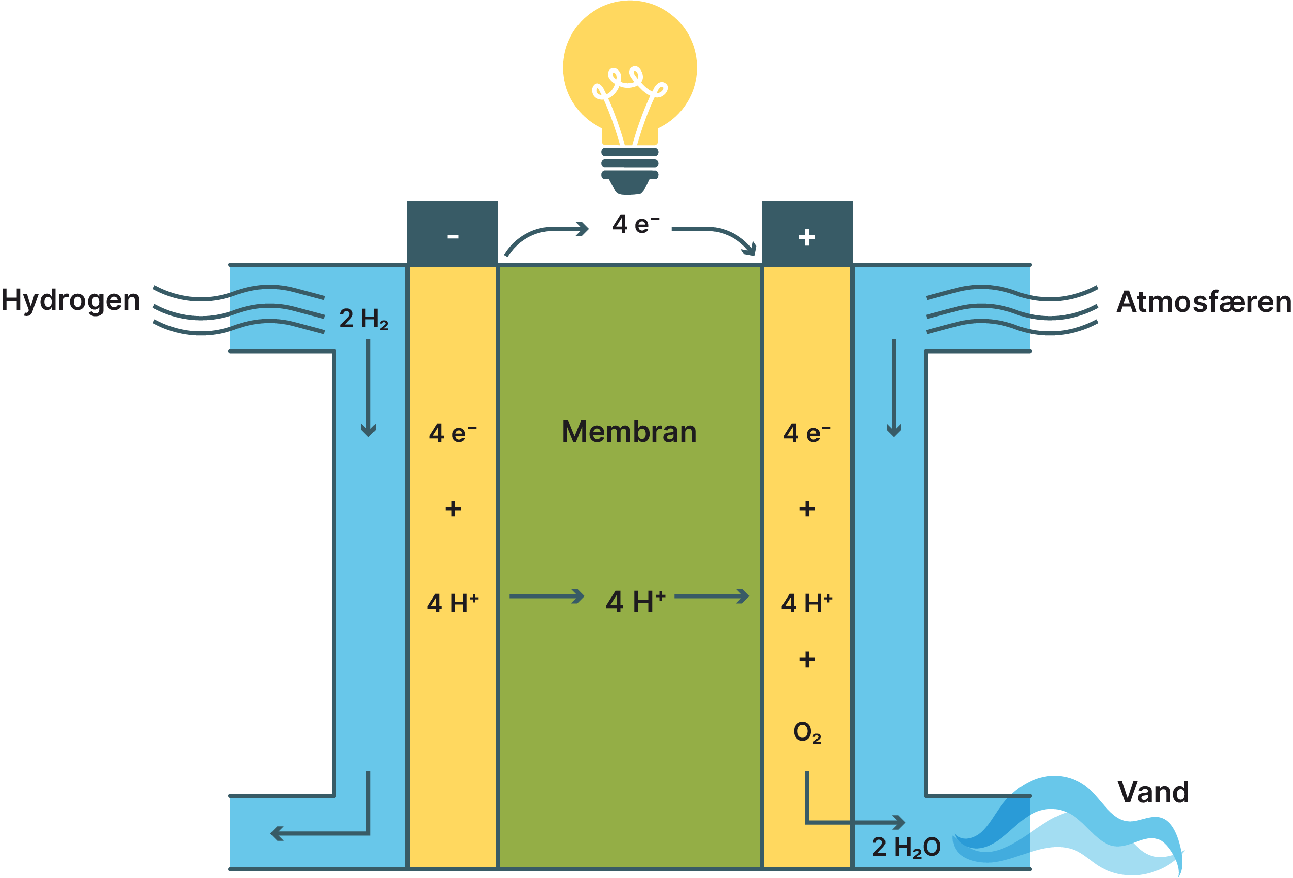 | Hydrogen kan fremstilles ved elektrolyse af vand. | |