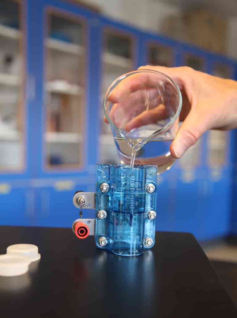 Fyld langsomt de to beholdere helt med demineraliseret vand. Bank flere gange forsigtigt elektrolysecellen mod bordet, så vandet lettere flyder ind i området omkring membranen