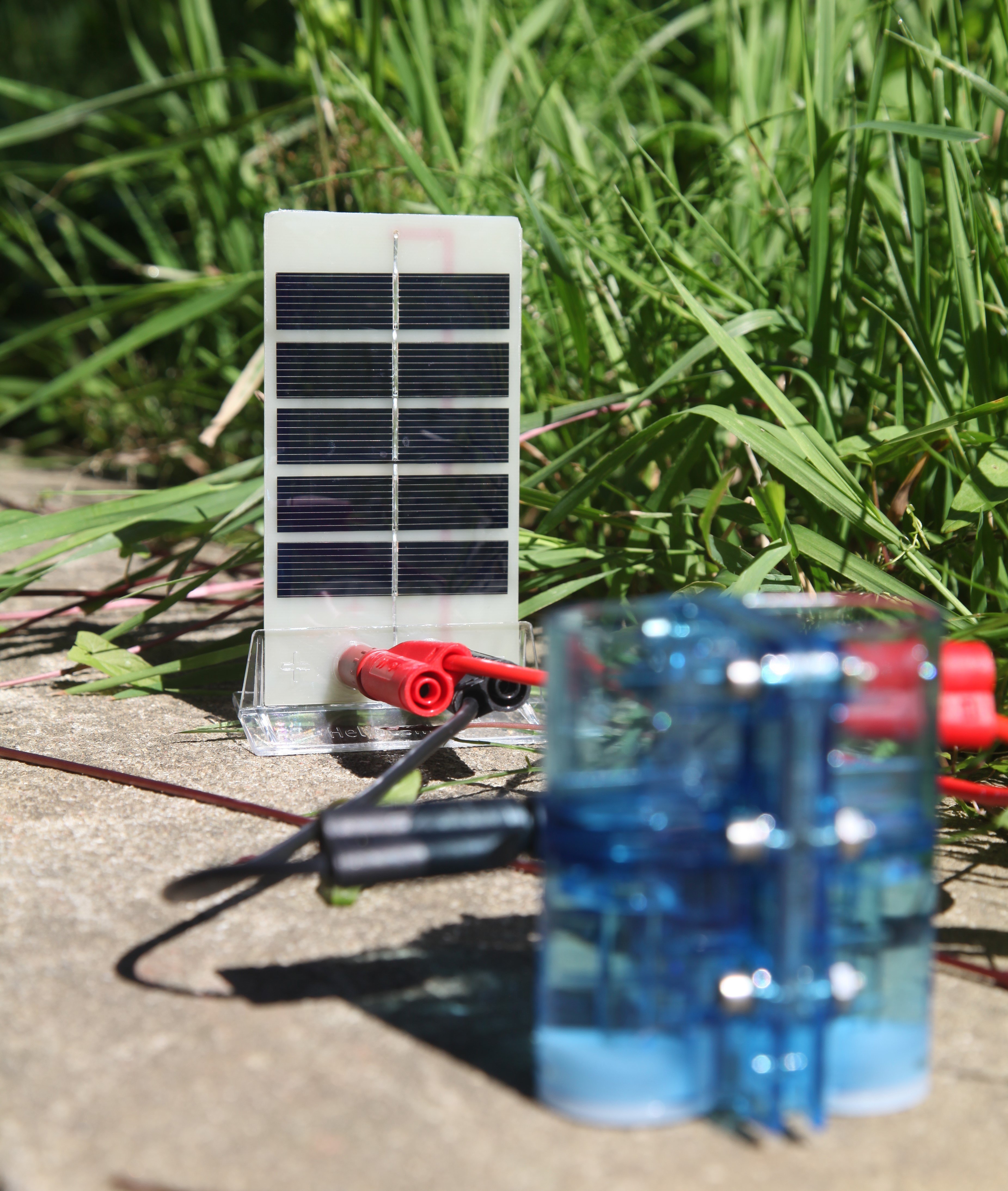Forbind elektrolysecellen til solcellen som vist på figur B4. Plus til puls og minus til minus. Rød til rød og sort til sort.