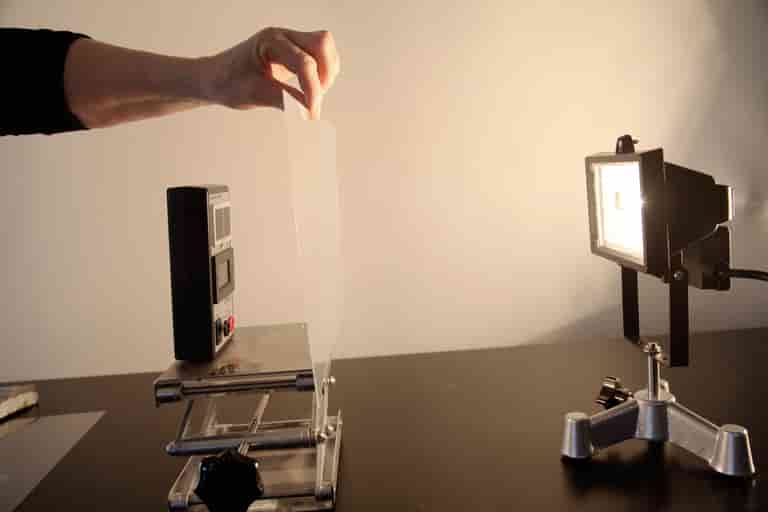 Afstanden mellem halogenlampen og håndpyranometeret skal være cirka 40 cm. Plastfolierne er anbragt ca. 10 cm foran pyranometeret.