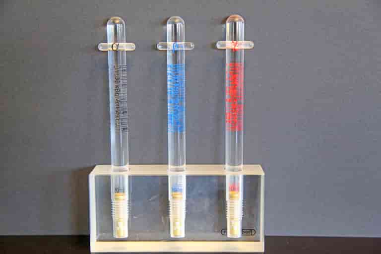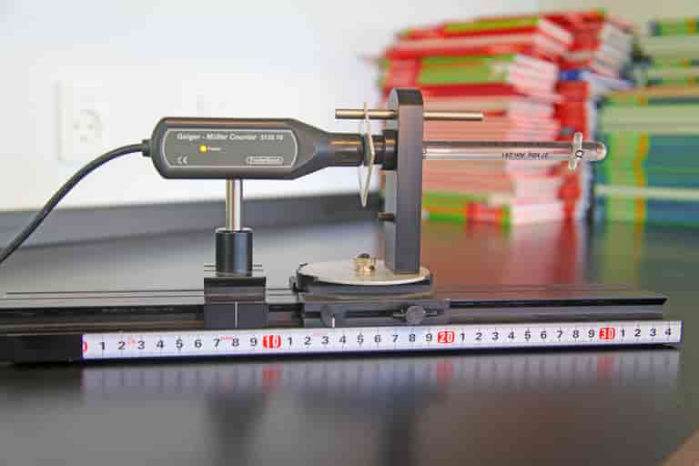 Opstillingsbænk med geigertæller og radioaktiv kilde. OBS: Før I begynder at måle på alfakilden, så skal I fjerne geigertællerens beskyttelseshætte – den sidder for enden af geigertælleren for ellers kan den ikke registrere strålingen fra alfakilderen. Når det er gjort, så er det vigtigt, at det undgås at skubbe enden af alfakilden indenfor kanten (dvs. stop før kanten til hullet af geigertællerens glimmervindue), da geigertælleren ødelægges ved den mindste berøring inde i hullet.