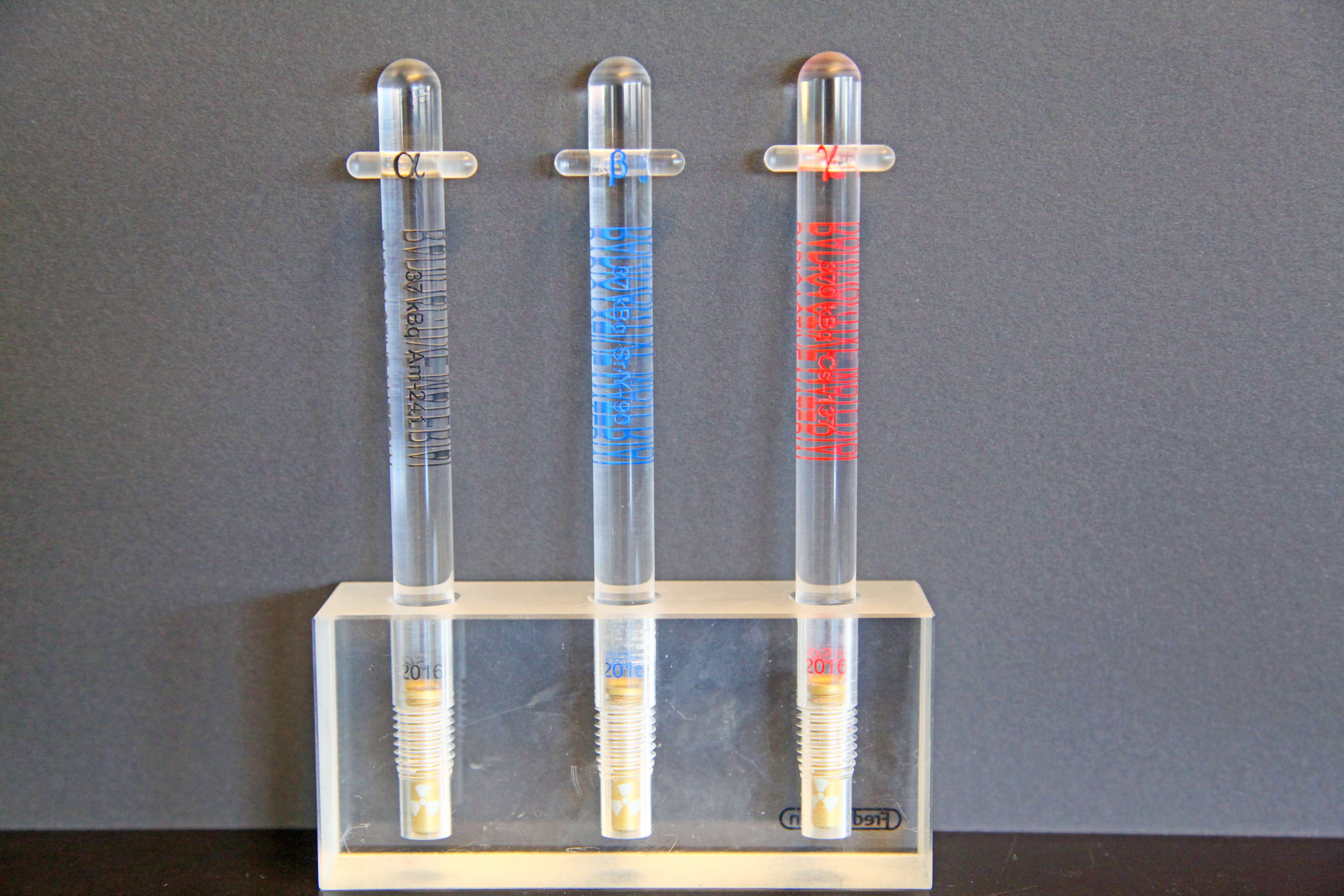 Indsæt forskellige stopmaterialer mellem den radioaktive kilde og geigertælleren.