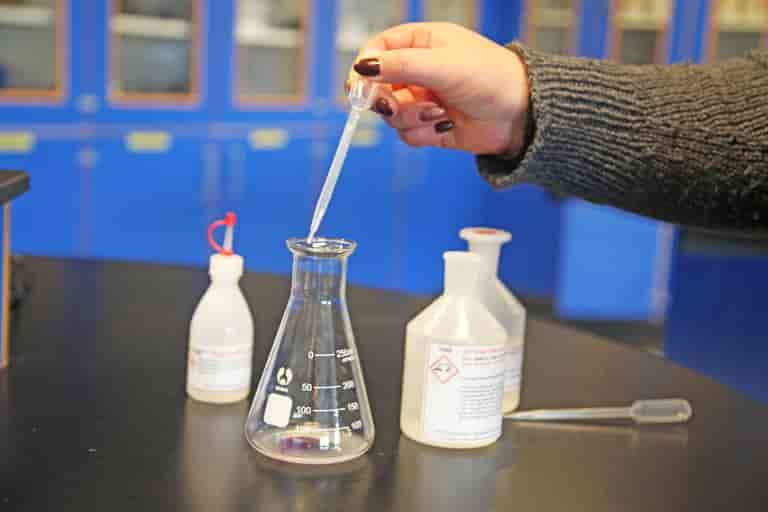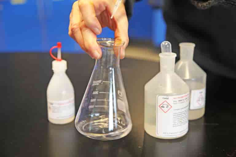 Dryp langsomt natriumhydroxid ned i kolben. Hver gang I har dryppet et par dråber natriumhydroxid i kolben, skal I langsomt rotere kolben, så væskerne blandes godt.