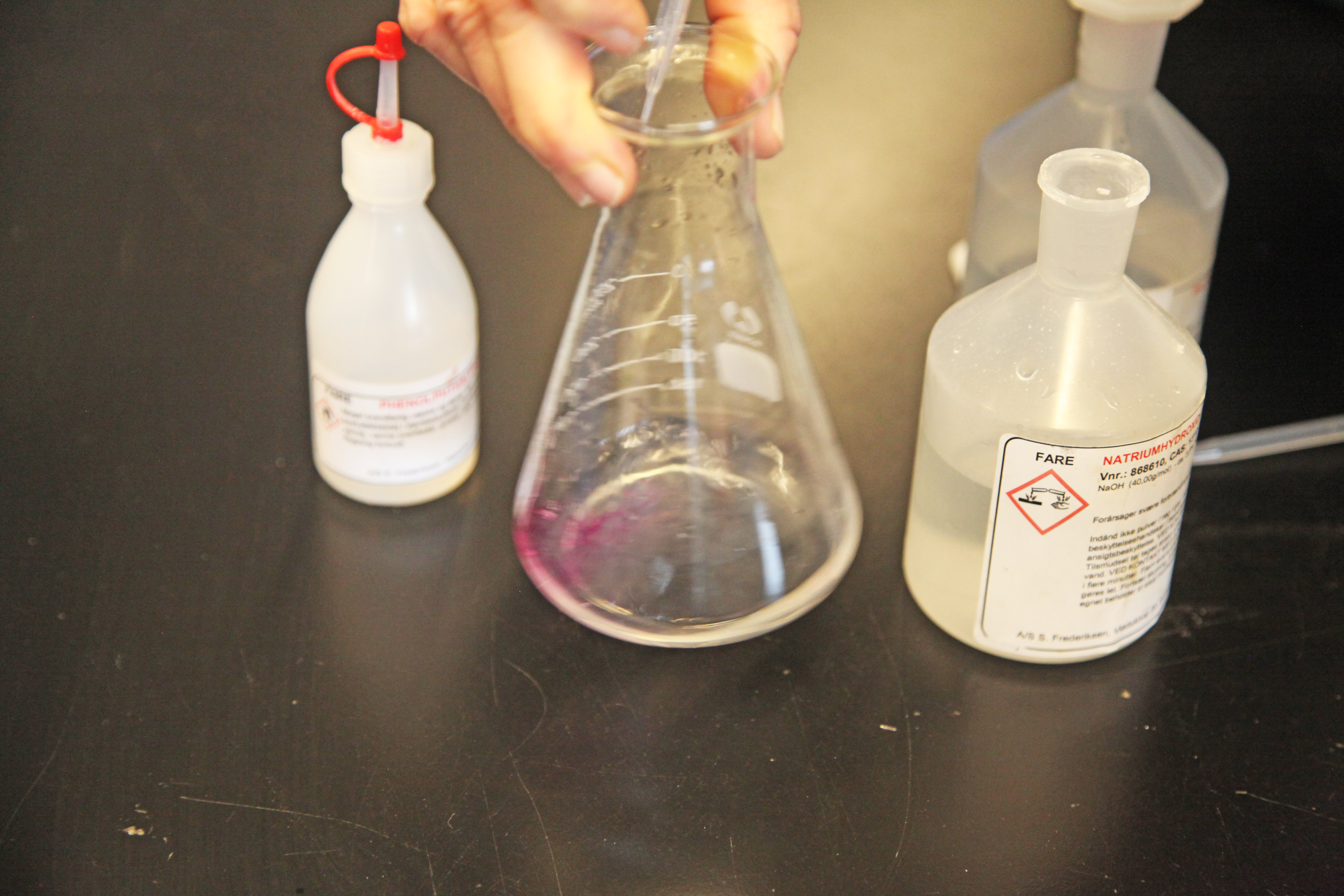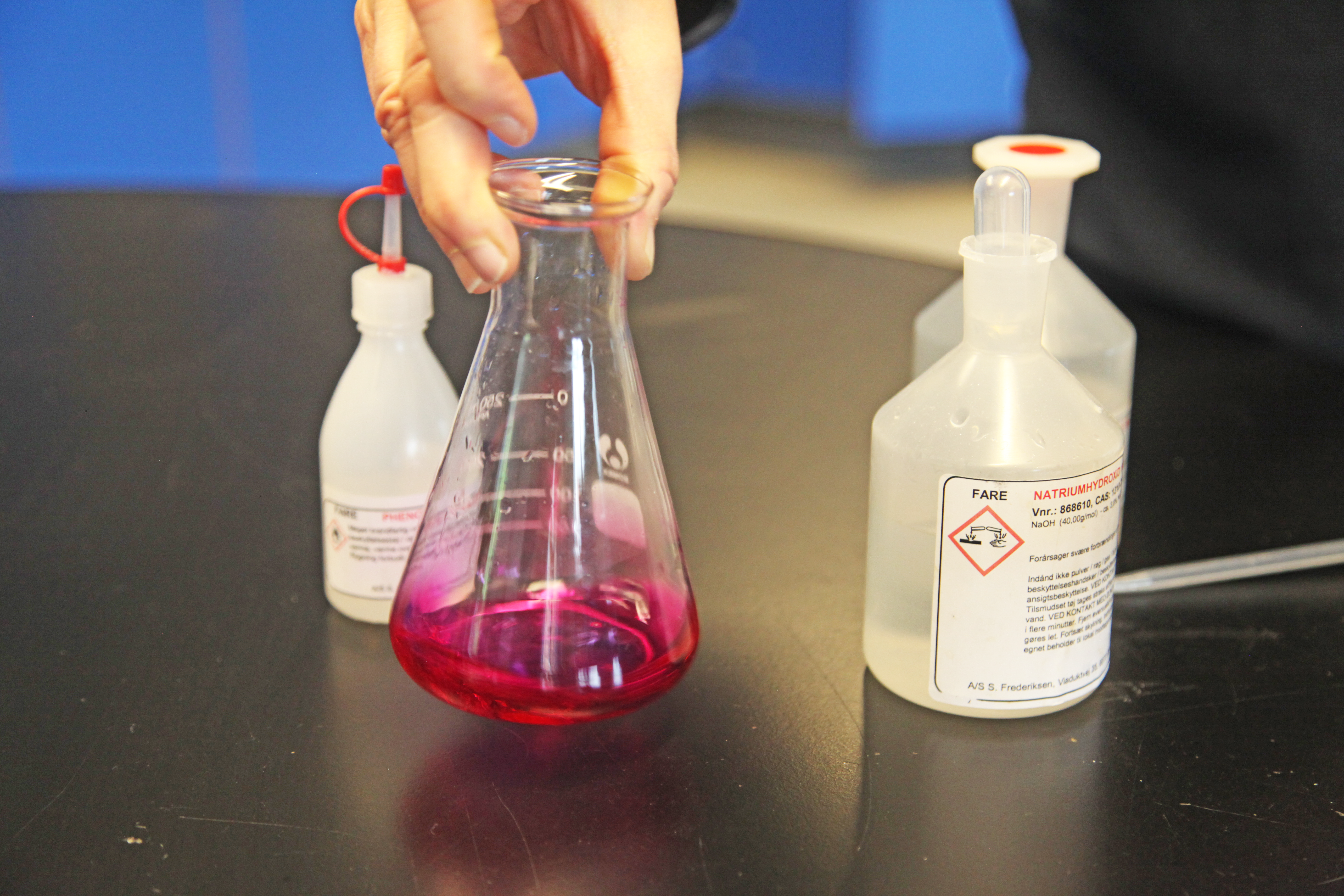 Hvis I har dryppet for meget natriumhydroxid i kolben, skal I dryppe en enkelt eller måske to dråber saltsyre i kolben, så I rammer det præcise omslagspunkt.